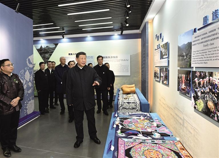 17日下午,习近平来到黔东南州黎平县肇兴侗寨考察。寨门口,身着民族盛装的村民唱起侗族大歌欢迎总书记。习近平饶有兴致地听取侗族大歌的艺术起源、曲调特点、演唱形式等方面介绍。随后,沿着村寨路道察看侗寨风貌和旅游商铺,不时驻足与店主、游客、村民互动交谈。在侗族文化展示中心,他详细了解侗族历史、风俗和服饰、建筑等特色文化保护传承情况。在侗乡特色产业基地,他观看蜡染工艺流程,对蜡染合作社坚持顾客至上、质量第一的运营理念给予肯定。习近平指出,少数民族文化是中华文化不可或缺的组成部分,既要保护有形的村落、民居、特色建筑风貌,传承无形的非物质文化遗产,又要推动其创造性转化、创新性发展,让民族特色在利用中更加鲜亮,不断焕发新的光彩。