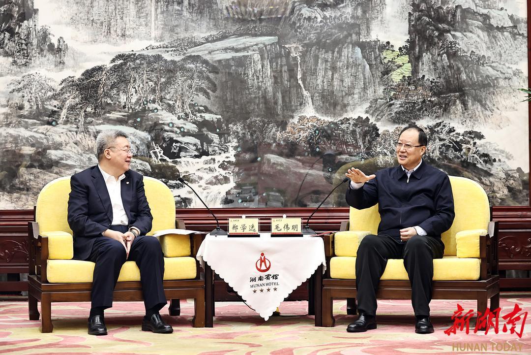 郑学选感谢湖南长期以来对中建集团的支持,并简要介绍了企业经营和在湘业务情况。他说,近年来,中建集团在湘各项业务保持稳中向好的势头,这得益于湖南优良的营商环境和高质量发展的强劲动力。中建集团将一如既往将湖南作为战略重镇,以中建五局为主力,积极参与全省交通、能源、水利、市政等重大项目建设,助力湖南城市改造更新、产业转型升级等,打造央地合作新典范。