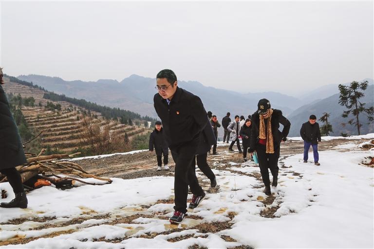 下雪天,陈延军(前一)到村走访察看情况。