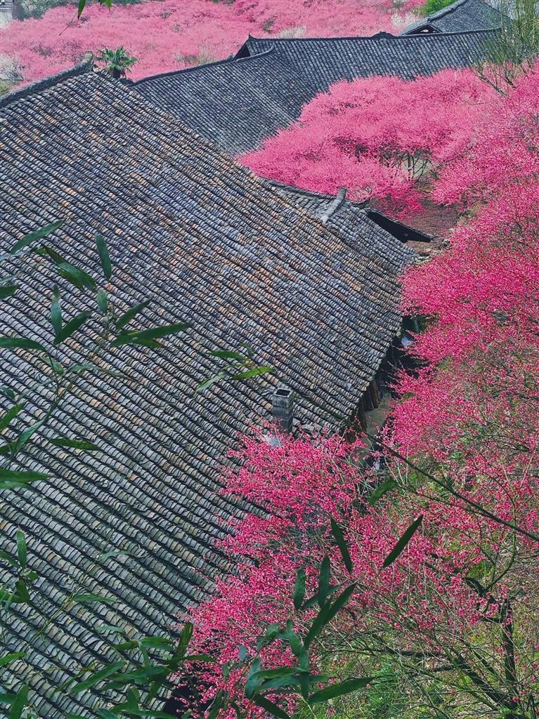 陈家坡的梅花,开得肆意又烂漫。那是半山腰的一片平地,梅花云霞般红艳艳地漫卷着,就如唐代吴融笔下“满树和娇烂漫红,万枝丹彩灼春融”描绘的那般浓烈。整个山寨被这梅花云霞紧紧环绕,只露出黑硬的三角形屋脊,龟壳般浮在云霞上。来这儿的人可不少,老人、孩子、青年都有,他们在漫坡的梅花林里,小得就像在其间缓缓移动的细碎芝麻。
