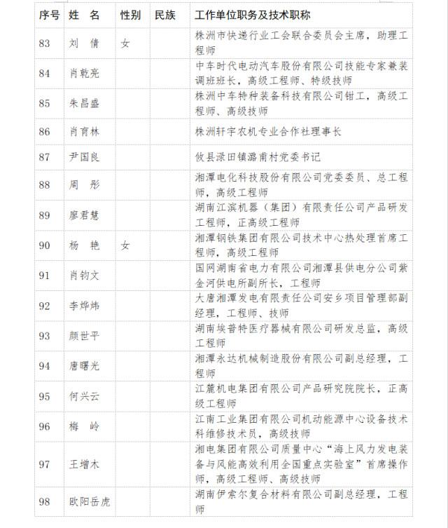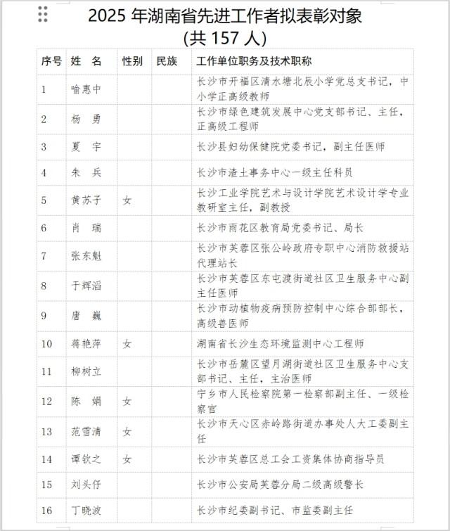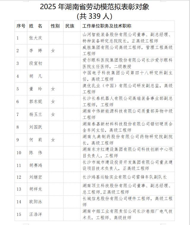 省委、省政府决定,开展省劳动模范和先进工作者评选表彰,表彰近年来在我省经济建设、政治建设、文化建设、社会建设、生态文明建设和党的建设等方面作出重大贡献,取得优异成绩的工人、农民、科教人员、管理人员、机关工作人员及其他劳动者。推荐评选工作坚持公开公平公正的原则,自下而上、层层选拔、好中选优,确定339名湖南省劳动模范和157名湖南省先进工作者拟表彰对象。现将拟表彰对象予以公示,公示时间为2025年4月14日至4月18日。如对拟表彰对象有异议,请于公示期间以电话、传真、信函(以到达日邮戳为准)等方式向省委办公厅(功勋办)反映。反映情况须客观真实,以单位名义反映情况的材料需加盖单位公章,以个人名义反映情况请告知或签署实名,并提供联系电话。
