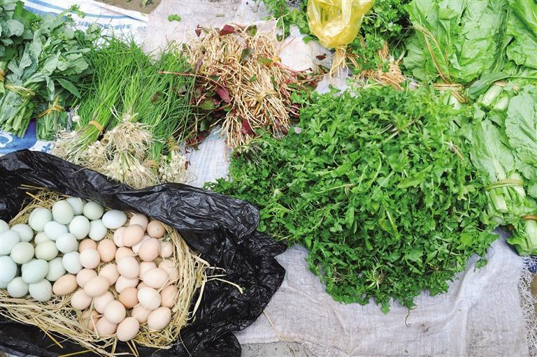 这是一个充满了山野气息的集市,跟着人流四处闲逛一番,各类时令果蔬、山茅野菜琳琅满目,一切都充满了山间地头的清新气息。