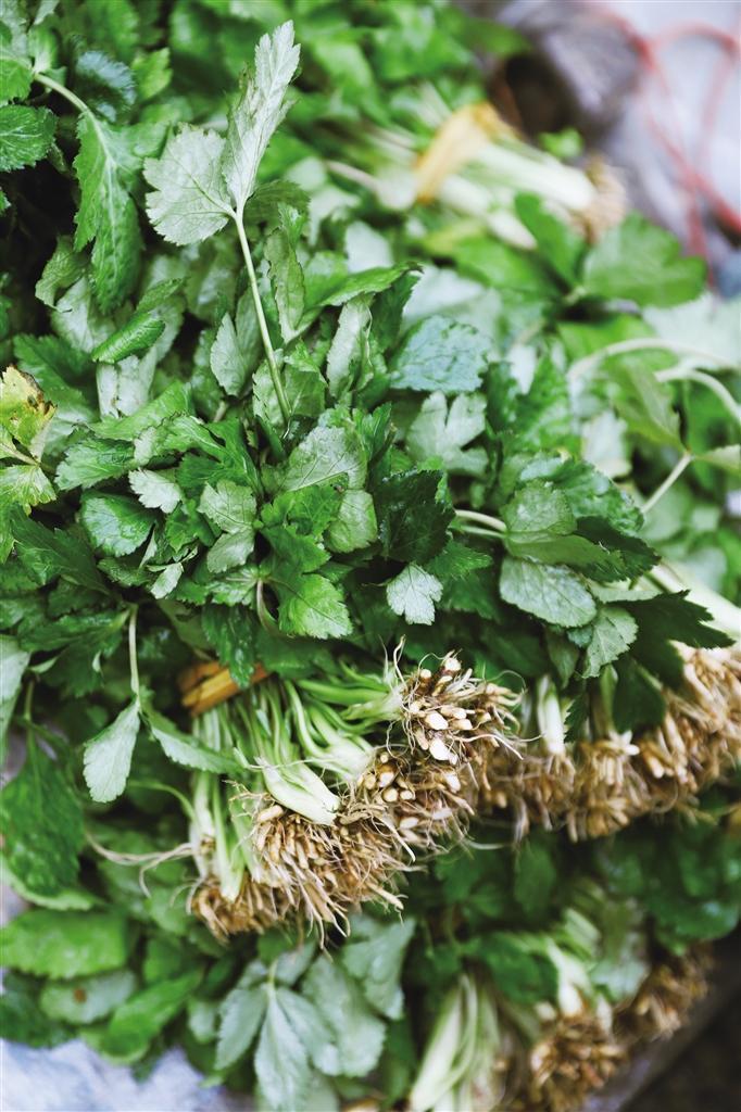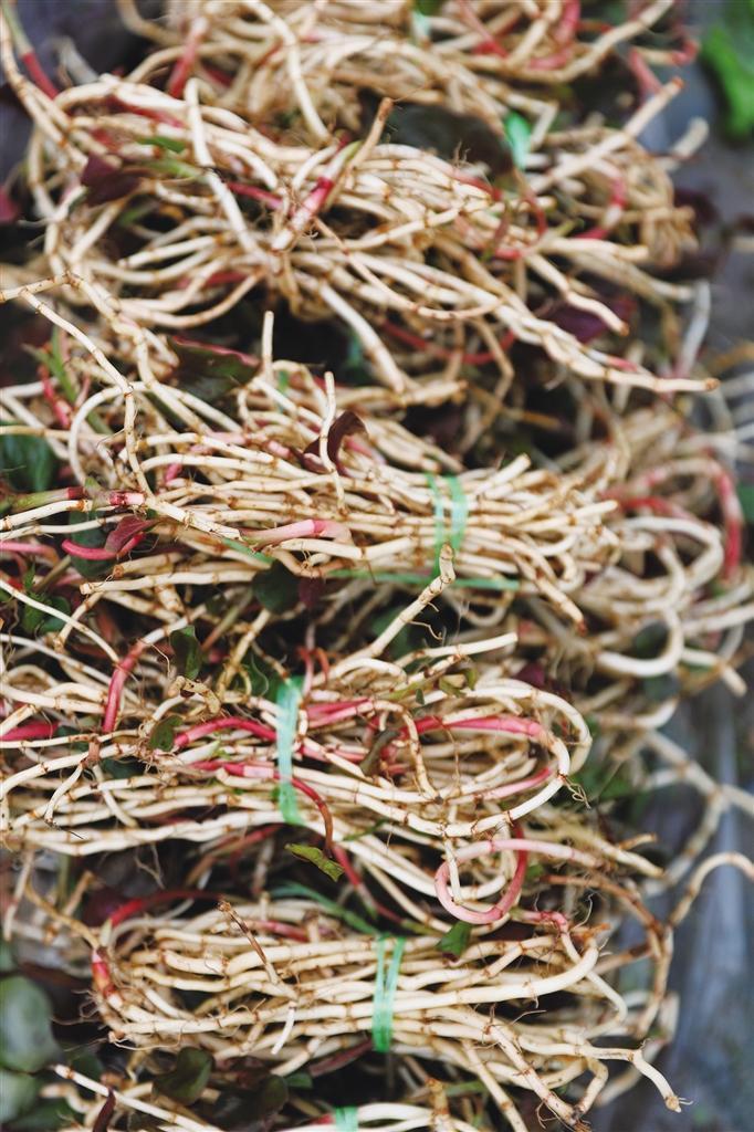 捆成小捆的折耳根,一般用来做凉拌菜,它有种冲鼻的香,是湘西的小吃摊或者早餐店的必备,味道奇怪而独特。