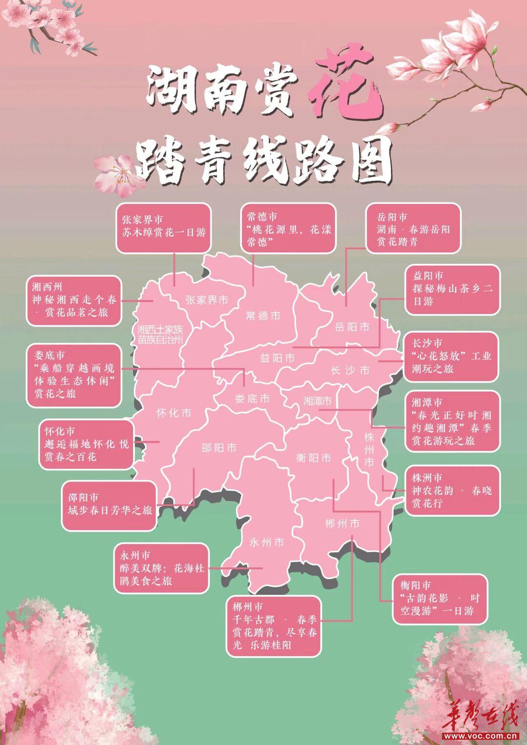溆浦穿岩山国家森林公园(杜鹃)→麻阳步云坪村(油菜花)→鹤城区中坡山国家森林公园(樱花)→中方半界村(桃花)→洪江市安江农校杂交水稻纪念园(绣球花)→洪江区嵩云山国家森林公园(梅花)→靖州排牙山国家森林公园(梨花)