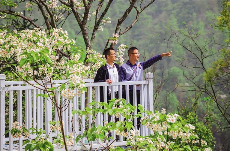 桐花树下,游客沉浸在纯粹的自然之美中,有的展开画板写生,有的拍抖音发视频,有的三三两两对唱山歌……林边空地上,有村民自发组织的歌舞表演,欢快的旋律和热情的舞姿,为宁静的山林增添了几分热闹与生机。