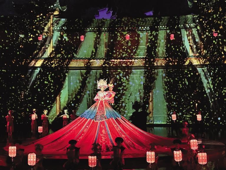 “逮喜酒咯——”门外响起锣鼓,我们跟随阿雅和石头走进了婚宴现场。数百盏大红灯笼照亮了夜空,圆弧形的长桌上早已摆放好了喜酒、喜糖、腊肉、酸萝卜、蒿菜粑粑。宾客落座,舞台中央一束灯光打在“阿雅”身上,娘正在为她梳妆打扮,叮嘱为人妻、为人媳、为人母的贴心话。此时,观众席上数百盏灯缓缓降落,为一对新人点亮一个新家。