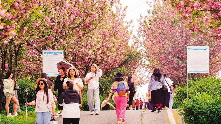热烈绽放的樱花,布满了道路两旁。似乎连天都变成了粉红色。游客们或打卡拍照,或开启直播,尽皆沉醉于这粉红的世界之中。