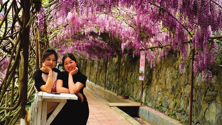 “英妹子”茶园旁的紫藤花开,香气扑鼻,引来无数游客打卡。