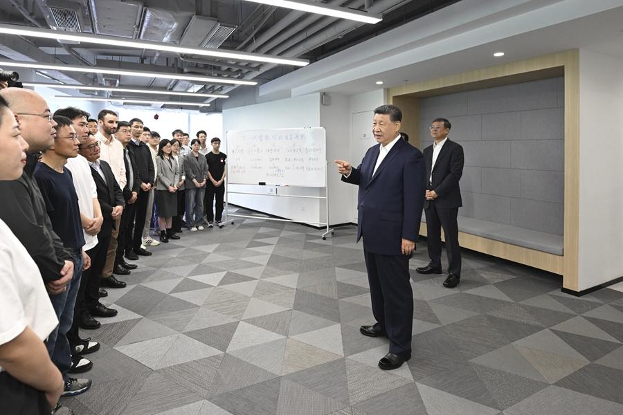 4月29日,中共中央总书记、国家主席、中央军委主席习近平在上海考察。这是习近平在位于徐汇区的上海“模速空间”大模型创新生态社区,同正在参加“下一代智能体的自主进化”主题沙龙的青年创新人才亲切交流。新华社记者 谢环驰 摄
