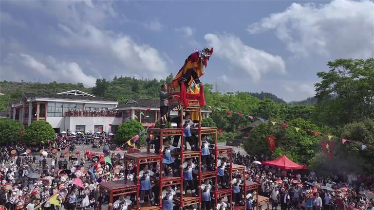 活动现场,苗族鼓手演绎迎宾鼓舞,激昂的鼓点瞬间点燃现场气氛。民间艺人赤足踏刃,稳步向上攀登,阿哥阿妹分列峡谷两岸唱着湘西古歌,原生态高腔与峡谷回声形成立体声场,撼动人心。狮子登高展示展演同样精彩,37张高桌叠在一起,最上面的一张四脚朝上,离地高度达15米以上,狮子绕场巡游一周后,进行狮子登高。