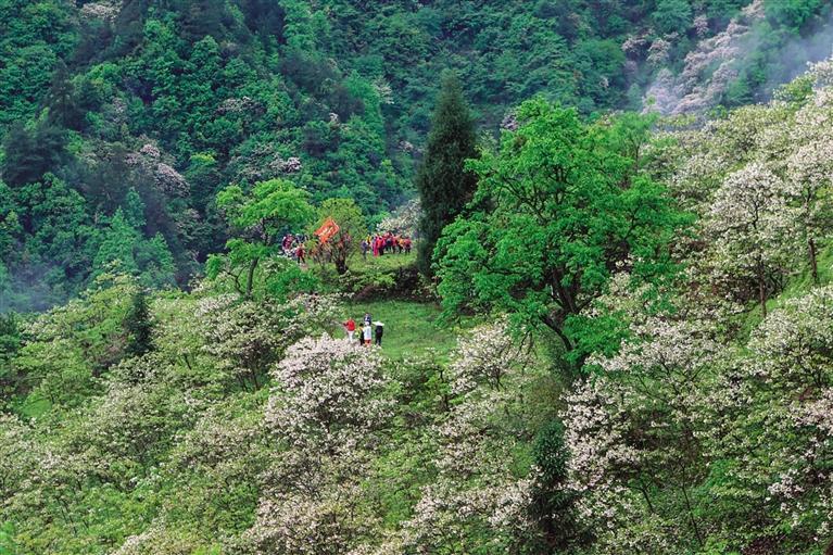春山苍苍,春水漾漾,远近山坡上浅红的杏花,深粉色的桃花,举着小火把的紫云英,香气扑鼻的刺槐花开得正艳。路边那些摇曳的野花,五颜六色,千姿百态,有的能叫上名,有的叫不上名。山涧石缝里溅出的水雾时而打湿眼睛,穿行在蜿蜒盘旋向上陡峭的山路,一路欢歌笑语。