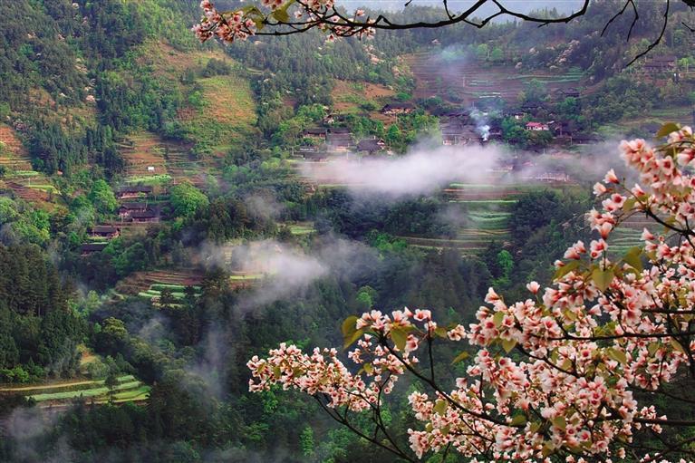 房前院落的青石板在阳光照耀下发出闪闪金光,院坝周围竹篱笆上,晾晒着刚腌制好的菜薹,发出淡淡清香,沁人心脾。极目远眺,桐花深处一栋栋依山而建的土家吊脚楼有的露出屋檐、有的露出屋顶……风拂花海,时隐时现,宛若仙山云海中的蓬莱仙阁。