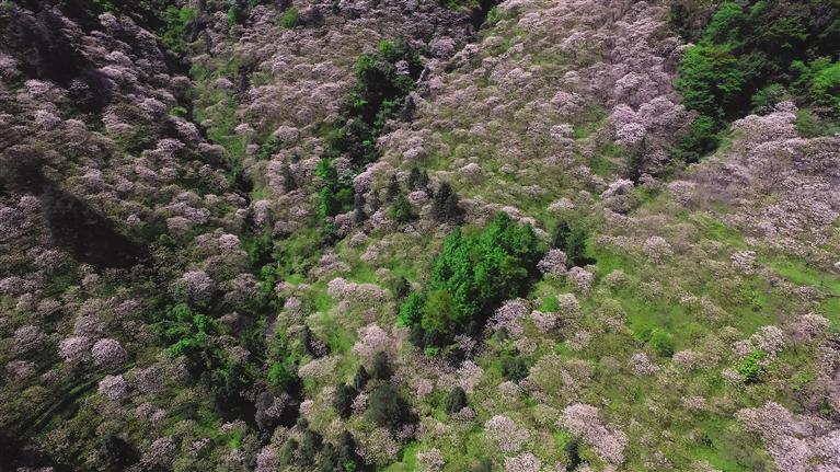 从空中俯瞰,山脉被桐花覆盖。