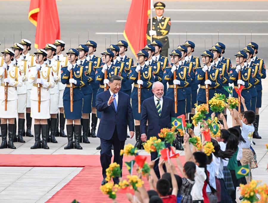 5月13日下午,国家主席习近平在北京人民大会堂同来华进行国事访问的巴西总统卢拉举行会谈。这是会谈前,习近平在人民大会堂东门外广场为卢拉举行欢迎仪式。新华社记者 燕雁 摄