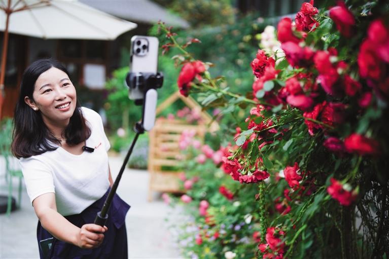 丁兰在花开时节,每天坚持直播6小时,收获一大批粉丝。 团结报全媒体记者 张谨 摄