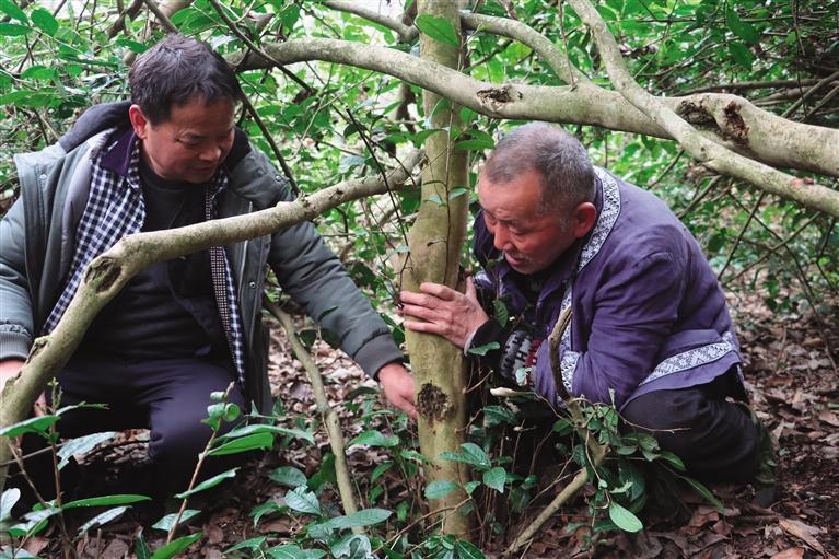 2024年4月会溪坪老茶树调查。右为古丈毛尖茶制作技艺省级代表性传承人张远忠,左为古丈毛尖茶制作技艺州级代表性传承人张峰。