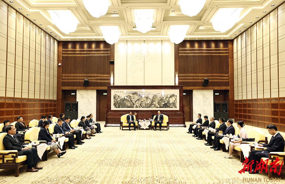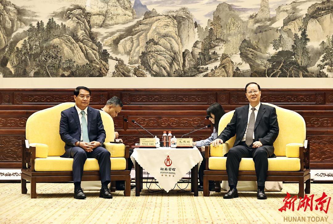 毛伟明对客人的到来表示欢迎并简要介绍湖南省情。他说,湖南与万象地缘相近、文化相通、情感相亲,近年来,在中老两国元首达成的重要共识引领下,双方高层互访频繁、经贸成果丰硕、友城往来密切、党建交流活跃、培训项目务实。老挝驻长沙总领事馆是新中国成立后外国政府在湘设立的首个领事机构;随着中老铁路的开通,怀化-万象班列去年累计开行351列,同比增长362%;精准扶贫首倡地十八洞村成为老挝代表团访问湖南的聚焦点,累计有29名万象市党政干部来湘培训。希望双方聚焦构建周边命运共同体,在深度融入共建“一带一路”中密切友城交往、深化经贸合作、加强培训交流,实现更高水平合作共赢。