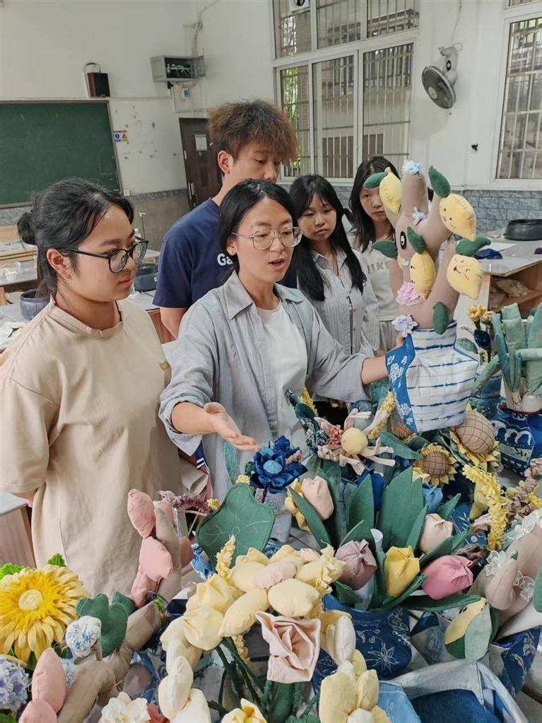 傅家轩(左二)点评学生创作的工艺设计作品。
