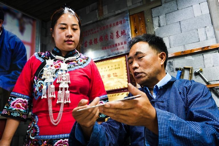 姑娘是苗族银饰锻制技艺代表性传承人麻利明的第12个徒弟,叫付文利。麻利明说,付文利很有悟性,跟着自己学了半年银饰锻制就能独立开店了。付文利虽然开了自己的银饰店,但每当遇到难题或接到大单,都会来咨询师父麻利明,麻利明也会耐心地做出指导和分析。师徒两人如家人般融洽。