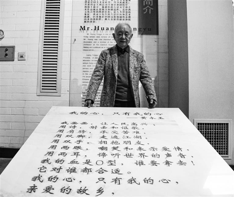 吉首大学黄永玉艺术博物馆,黄永玉站在自己的作品前。