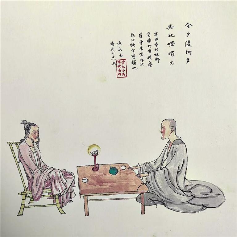 壁画最后一幅,画中两个人物,一僧一俗,相对而坐。中间条案上一盏油灯,一壶二杯,隔桌对饮。让人感觉画中茶水飘起的清香和闪跳的灯光融合在一起,两个人的心境在安然宁静中息息相通,凡尘世界与禅宗境界在温暖的灯光里相对相处。题跋是“今夕复何夕,共此灯烛光”。这诗意的感怀,似乎是先生把自己置身于画里,暗示画这批壁画的机缘。而那盏如豆的灯火,似乎因为先生的点亮而闪耀着人文精神的光芒。
