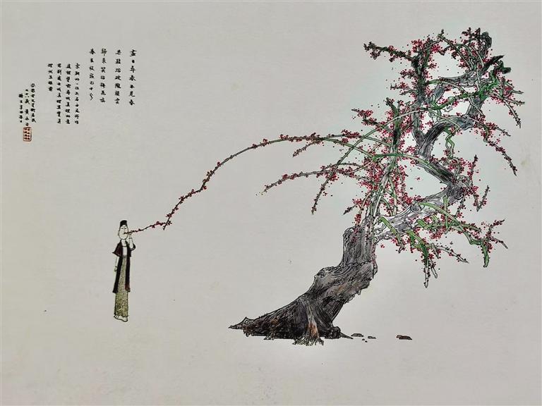 先生登高作画,一树古梅,花开灿烂。