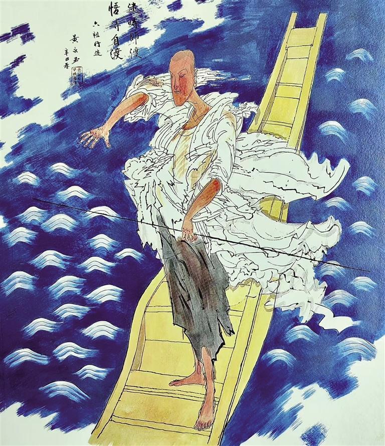 画慧能三幅:一为于江湖之上,手持竹篙,划一扁舟,题“迷时师渡,悟时自渡”;一为避难与猎人为伍,放生所获猎物,共餐时“但吃肉边菜”;一为神秀、慧能关于菩提镜台“有”与“无”的辩答,偈语诗外补题“菩提树镜台尘埃原都是实在的东西,连你慧能都是物本身,硬说它无是说不过去的”。