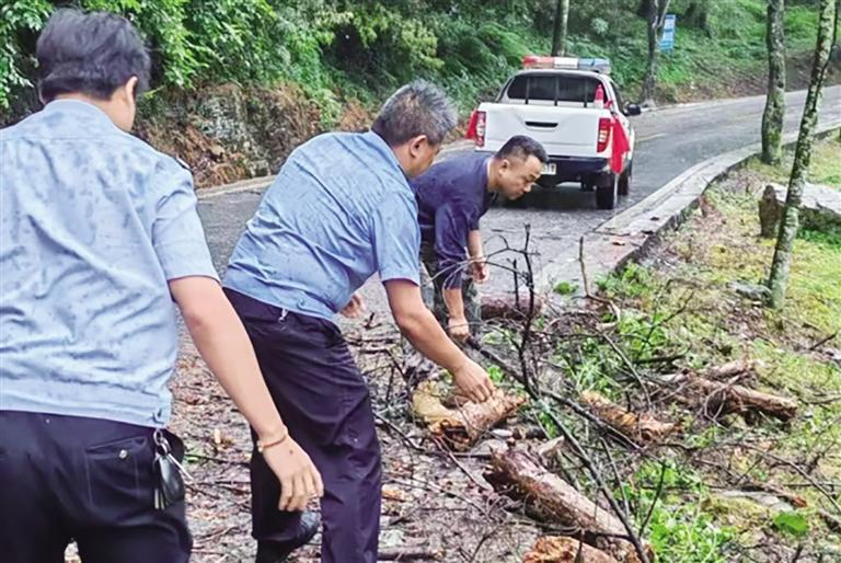 6月19日,永顺县万坪镇辖区民警和志愿者清理路面泥石、树枝等障碍物。 瞿章杰 王津 摄