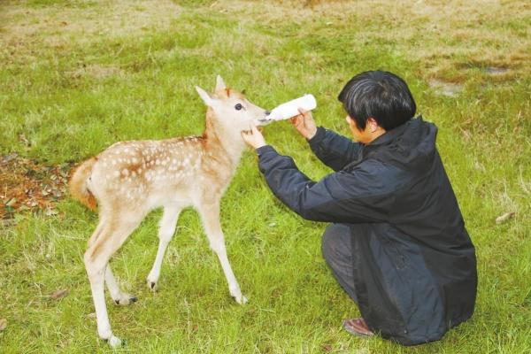 杨晓强在喂养麋鹿“点点”。(资料图片)通讯员 摄