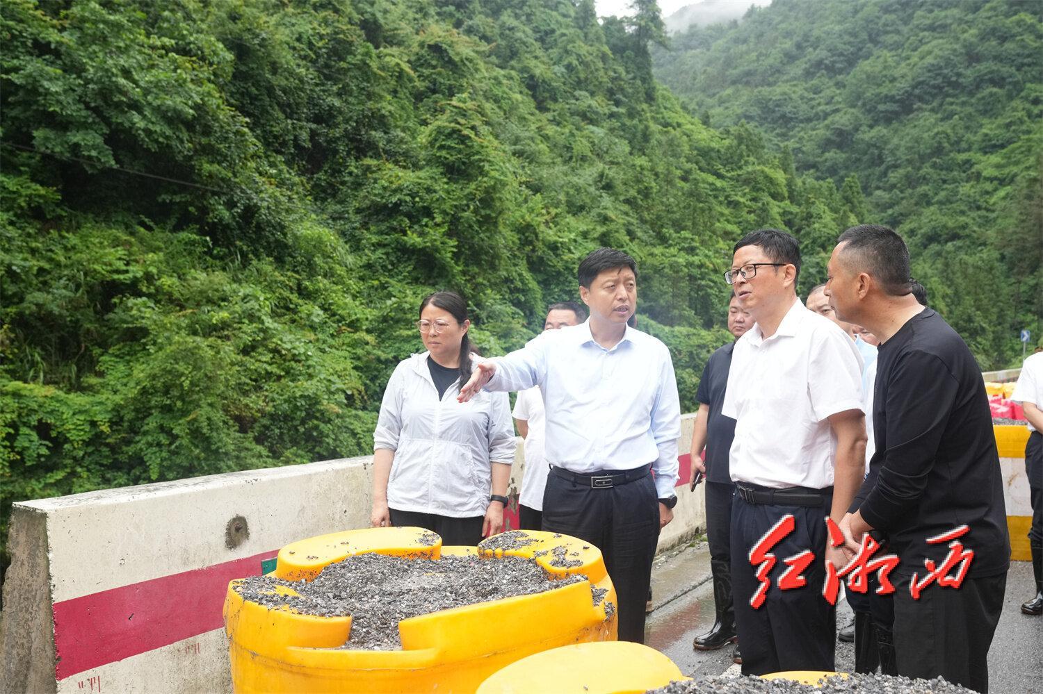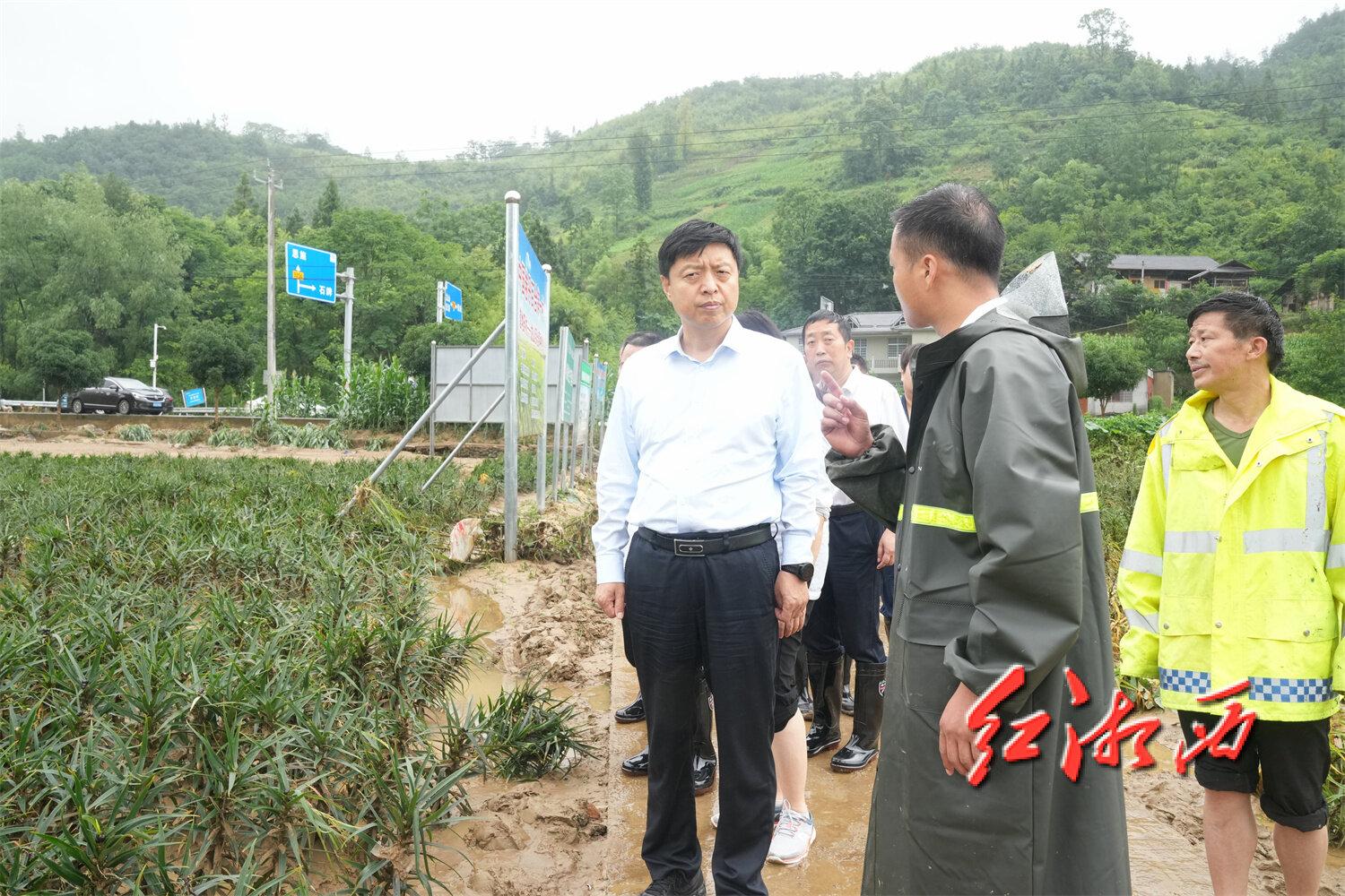 在兴隆街道响水洞村灾毁点,刘涛查看水毁路基抢修情况,要求抓紧修复水毁路段,科学处置道路坍塌,尽快消除安全隐患。在石牌镇上母村,刘涛走进田间地头查看百合受灾情况,到果乐农业科技公司了解百合收购、加工情况,要求尽快组织村民开展生产自救,发挥企业优势,做好农作物抢收、初加工等工作,最大程度降低受灾损失。