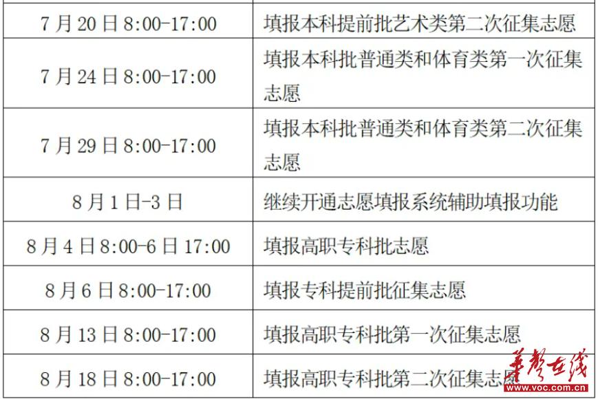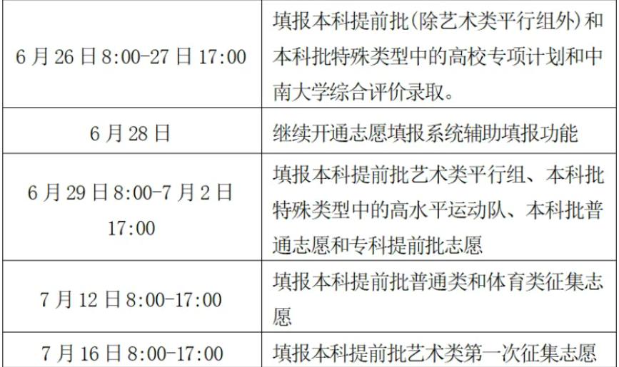我省今年普通高校招生网上填报志愿分三个阶段进行。第一阶段:6月26日8:00-27日17:00,填报本科提前批(除艺术类平行组外)和本科批特殊类型中的高校专项计划和中南大学综合评价录取;第二阶段:6月29日8:00-7月2日17:00,填报本科提前批艺术类平行组、本科批特殊类型中的高水平运动队、本科批普通志愿和专科提前批志愿;第三阶段:8月4日8:00-6日17:00,填报高职专科批志愿。具体填报时间(含各批次征集志愿填报时间)详见下表: