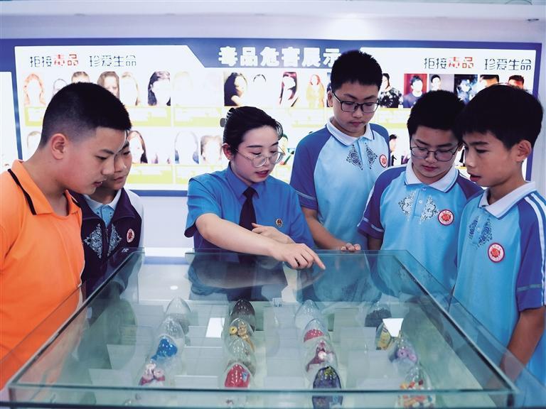 6月24日,古丈县禁毒教育基地展厅内,该县检察院“茶乡护苗”法治宣讲团成员在向学生讲解新型伪装毒品“跳跳糖”。这类毒品以鲜艳包装、香甜口感伪装,会对神经系统造成不可逆的损伤。通过参观学习,进一步提高学生对毒品危害的认识,增强识毒、拒毒、防毒意识,筑牢青春禁毒防线。 本报全媒体记者 彭伟 通讯员 王诗琪 摄