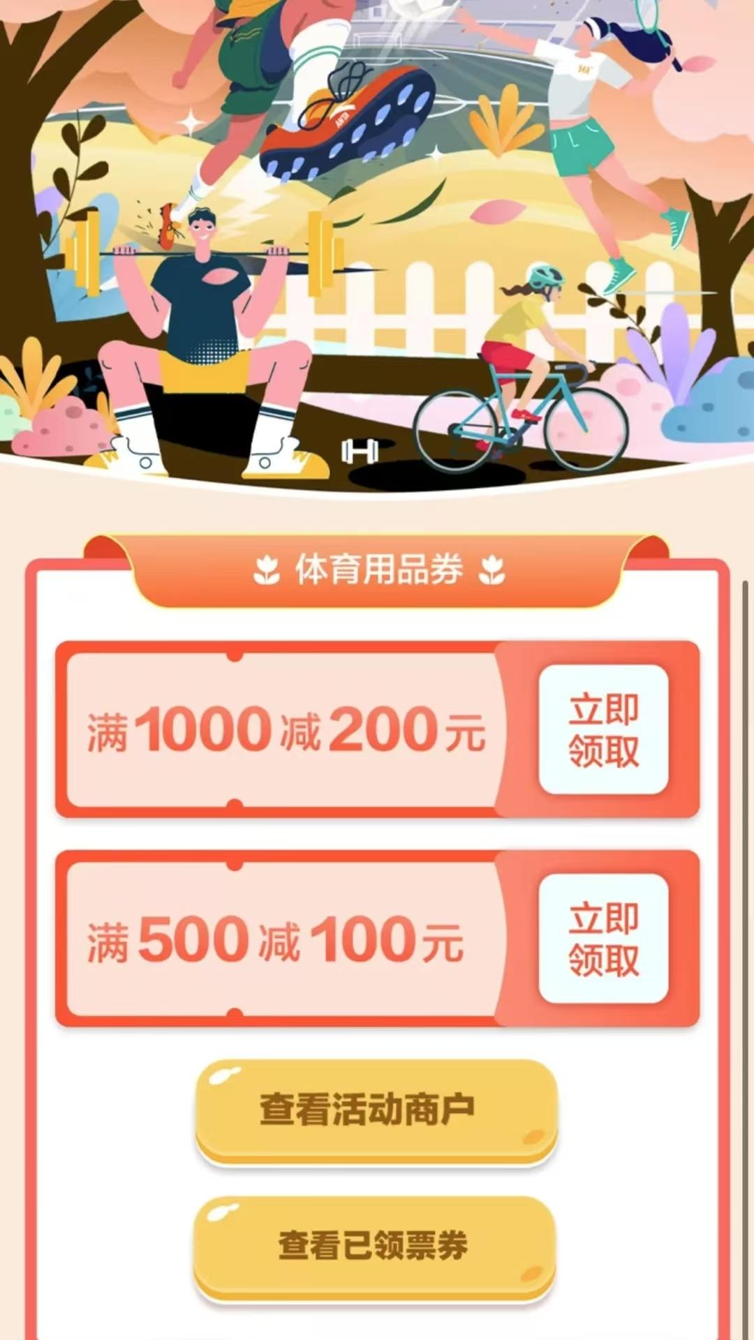每天上午10点,体育用品券、体育场馆券、航空运动券带着四档满减福利(满1000减200、满500减100、满300减60、满300减50)准时“上线”,还有商户专属券惊喜加码。