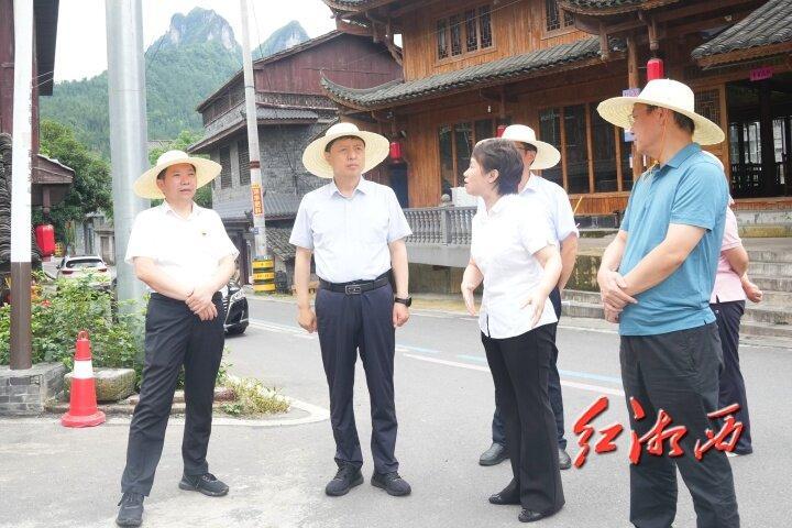 7月1日,湘西州委书记刘涛到保靖县、吉首市、花垣县专题调研“四好农村路”建设工作并主持召开座谈会。图为刘涛(左二)在保靖县吕洞山镇夯沙村调研公路沿线路域环境整治工作。团结报全媒体记者 刘炜 摄