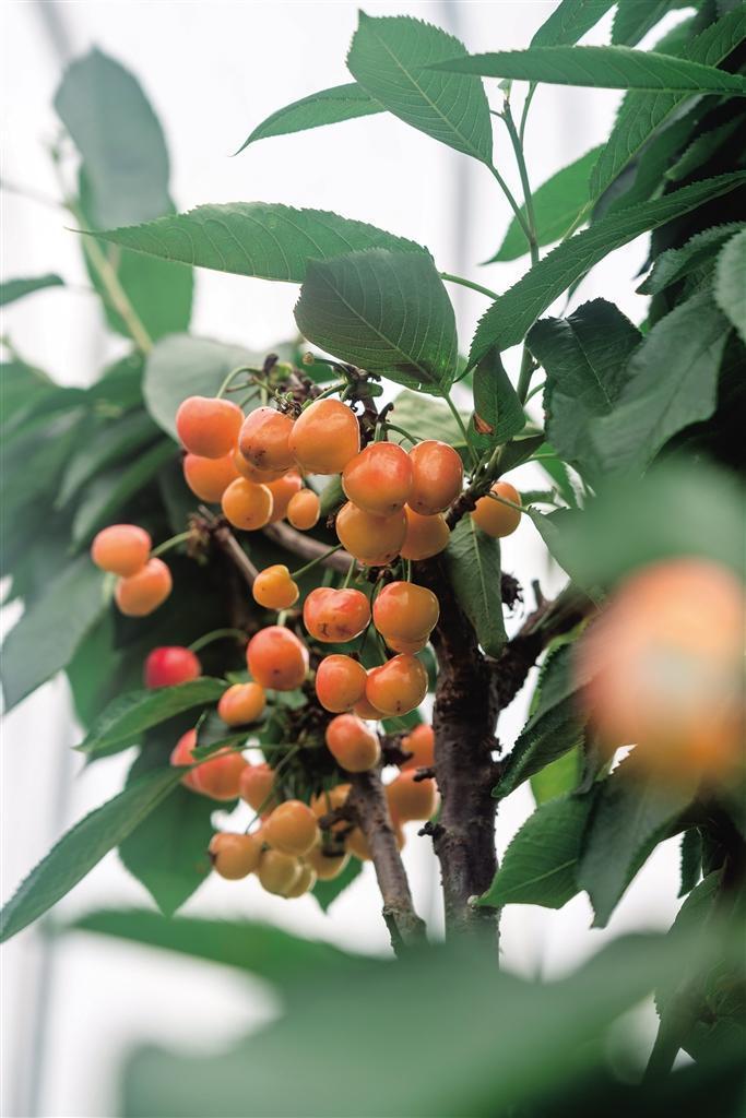目前,基地共建有12座现代化种植大棚,种植面积24亩,引进俄罗斯8号、美国大红、美早、萨米脱等四个樱桃新品种1500棵,通过抖音直播和线下销售,已实现销售2000多公斤,实现销售收入20多万元。同时,基地还引进甘平柑橘、红橘、黄橘、美国西柚、泰国蜜柚等室外柑橘类挂果果树9200棵,其他水果育苗培植区20亩,预计年收入60多万元,基地每年用工5000多个,带动附近150余名农民工就业。