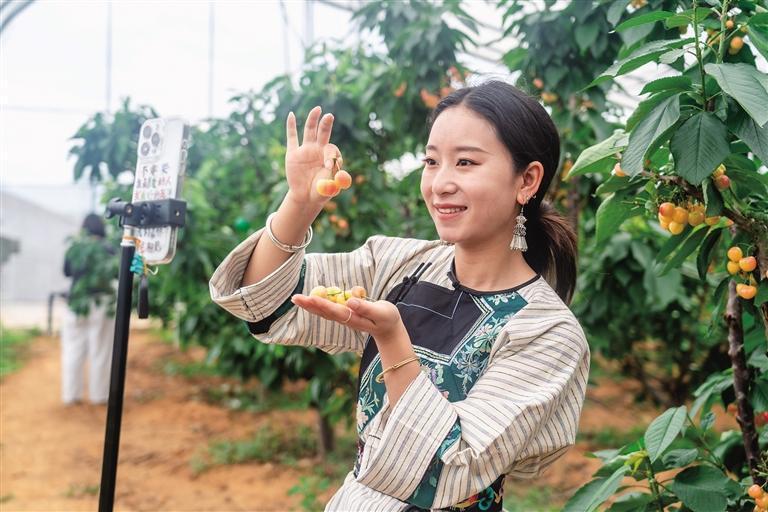 主播在樱桃园里开起直播,线上推介好吃的樱桃。