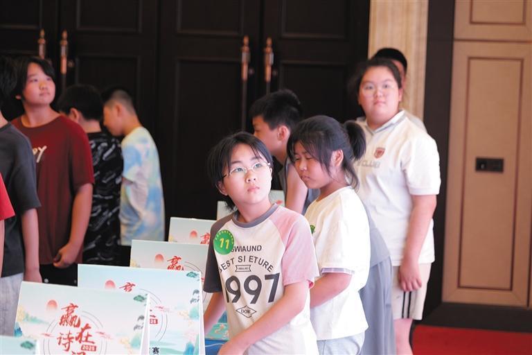 晨光初露,雏声破晓。小选手们在家长的陪伴下早早抵达现场,他们的脸庞上,期待与紧张交织——有的“面壁”冥想,反复背诵着诗句;有的怯生生地依偎在家长身旁,时不时朝赛场张望,既忐忑,又憧憬;来自湘潭市火炬学校教育集团的选手曹玉桉,捏着小拳头为自己加油打气;来自长沙市清水塘江湾小学的选手欧试玉,则在这片诗词宴会中结识了吉首市芙蓉学校的李凯,两只小脑袋凑在一起,看赛前准备的习题,眼睛亮得像撒了把星子。