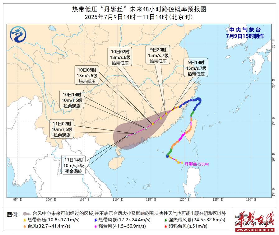 热带低压“丹娜丝”未来48小时路径概率预报图。 图源:中央气象台
