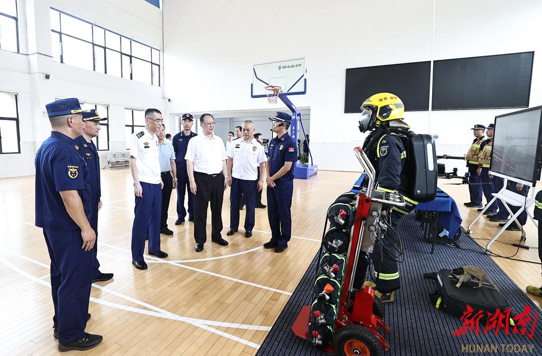 在长沙市消防救援支队洋湖消防救援中心站,毛伟明一行实地了解基层站所建设、消防装备配置等情况,强调要将人员装备等力量下沉基层一线,提升人员素质和装备现代化、智能化水平,提高消防网格化水平,守牢安全防范“最后一公里”。来到省消防救援总队,毛伟明先后参观了队史荣誉馆、指挥中心等,并连线慰问郴州市消防救援支队资兴大队指战员,感谢他们在资兴市“7·5”游船侧翻事故中应对迅速、处置科学、救援有力,以最大的努力、最小的损失取得了最好的成果。毛伟明说,大家长期奋战在灭火救援和抢险救灾最前沿,召之即来、来之能战、战之能胜,体现了强烈的革命精神、奉献精神、担当精神和高度的专业精神。希望大家要始终坚持人民至上、生命至上,继续弘扬光荣传统,锤炼专业本领,用实际行动守护万家灯火和百姓安宁。