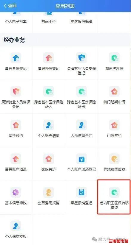 第一步:进入湘医保App,找到“经办业务”模块,点击“省内职工医保转移接续”。