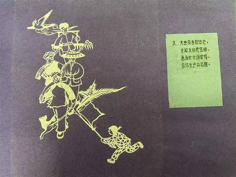 这是一件创作于 1959 年的剪纸作品集,开本大小约 36cm×25cm,深红色的硬塑外壳,内芯逐页放置 55 幅精美的剪纸作品,这些剪纸作品一改传统剪纸以花草、鸟兽、鱼虫为主要内容的创作手法,深蓝色的纸稿上一组组生动活泼、惟妙惟肖、栩栩如生的人物形象跃然其上,作品封面用烫金小楷写着《杨玉翠纸雕》。这是湘西州第一位中国美术家协会会员黄靠天为庆祝新中国成立十周年,以湘西州第一个 “全国三八红旗手”、曾作为全国 八个少数民族妇女代表受邀到周恩来总理家做客的杨玉翠为原型创作的连环画剪纸作品底稿。