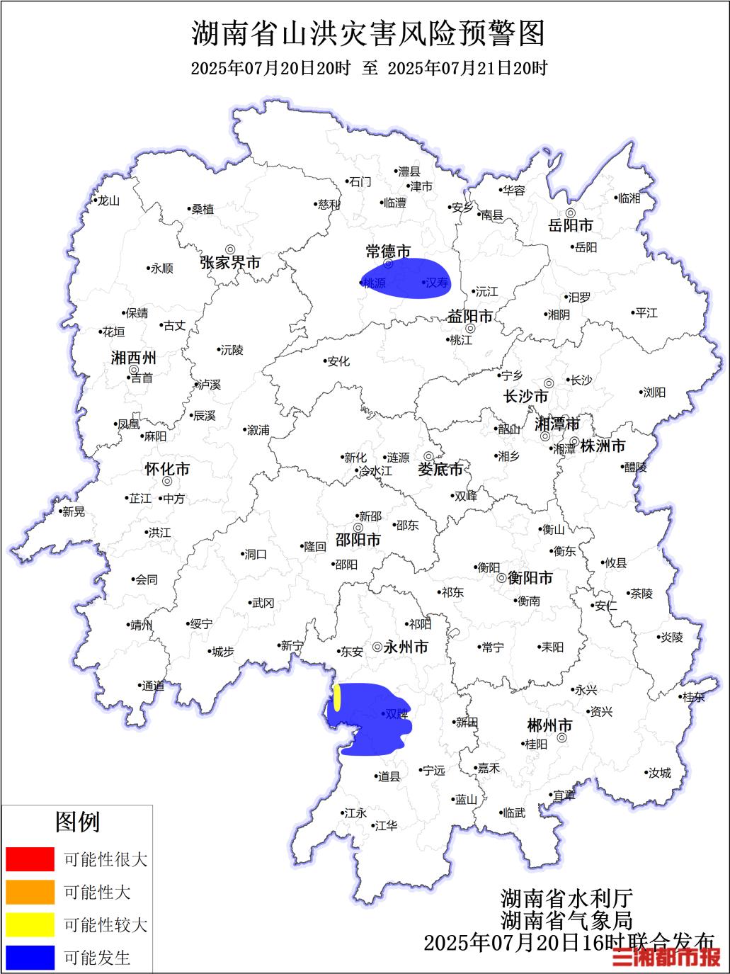 华声在线7月20日讯(全媒体记者 李致远)根据省气象局7月20日预报,省水利厅与省气象局联合会商得出如下结论:受降雨影响,20日20:00至21日20:00,永州市、常德市等局地可能发生山洪灾害。