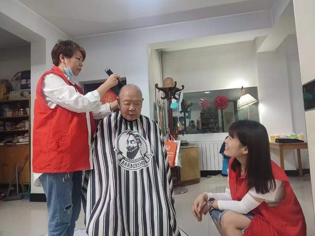 西安市碑林区黄雁社区的工作人员和志愿者上门为留守老人提供剪发服务。(受访者供图)