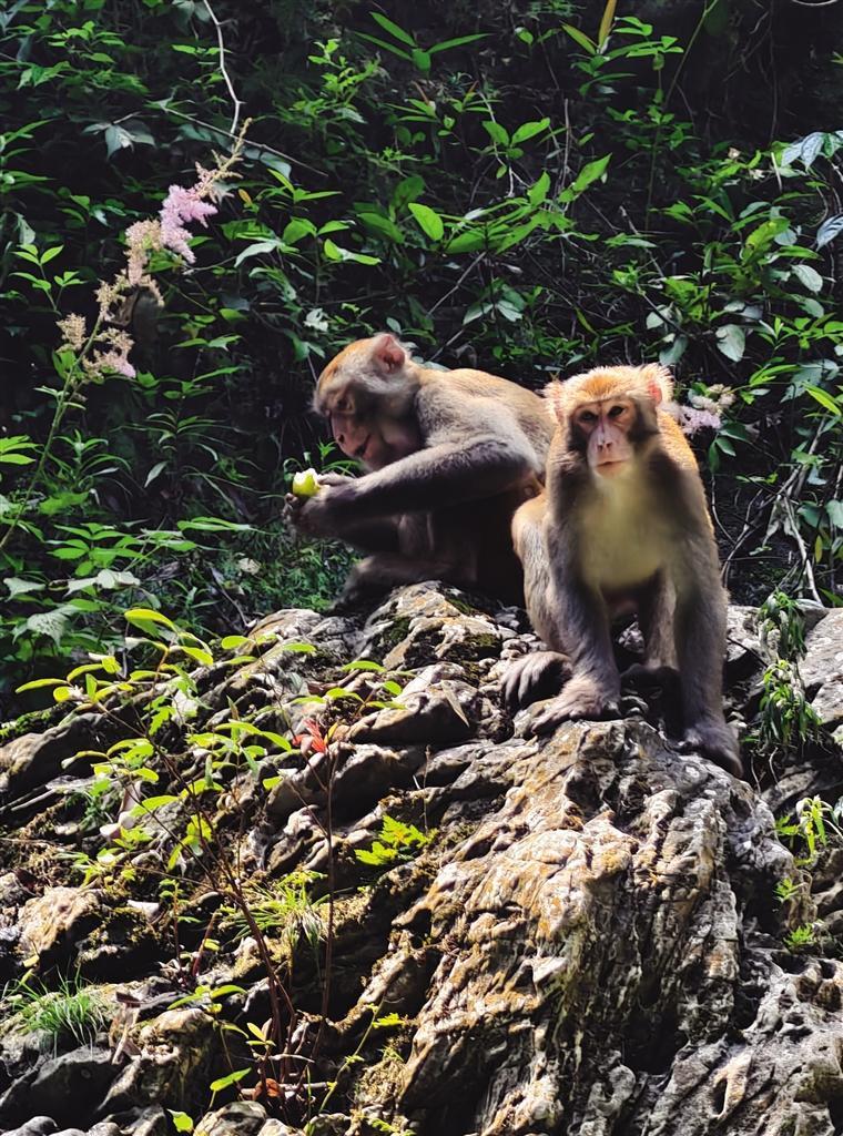 猛洞河沿岸,野生猴子在绝壁上行走,如履平地。