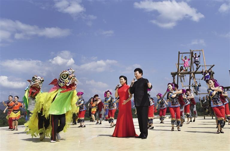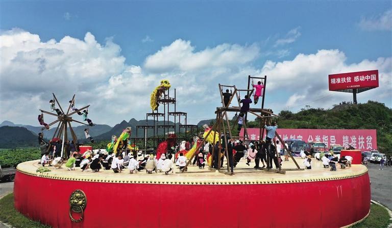 2020年8月22日,花垣县双龙镇十八洞村民在猕猴桃基地表演《苗族赶秋》 。
