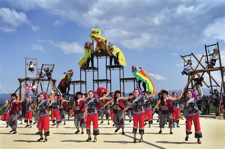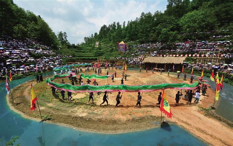 这天,秋场上除了玩“秋千”,苗族鼓舞、舞龙、苗族狮舞、苗族武术、高脚马、绺巾舞、苗歌对唱……甚至在水上抢鸭子等一批富有苗族传统文化特色项目也在节日活动中激情上演……