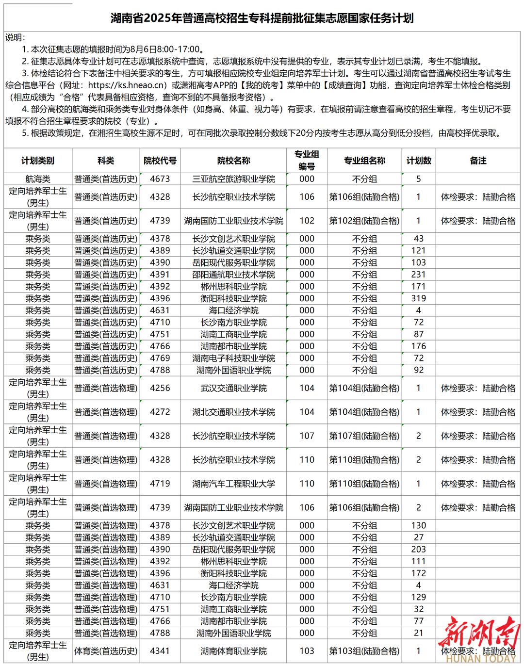 华声在线8月5日讯(全媒体见习记者 沈可心)共2414个名额!刚刚,湖南省2025年普通高校招生专科提前批征集志愿国家任务计划出炉,本次征集志愿的填报时间为8月6日8:00—17:00。记者注意到,乘务类计划占了绝大多数,只有少量计划是定向培养军士生。