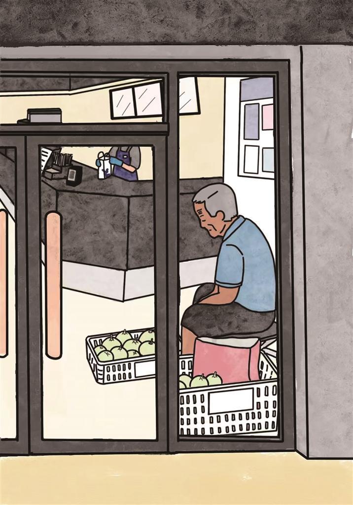 8月3日,吉首一商场咖啡馆,卖香瓜的老爷爷在打盹。(根据网友视频绘制) 杨岳 绘