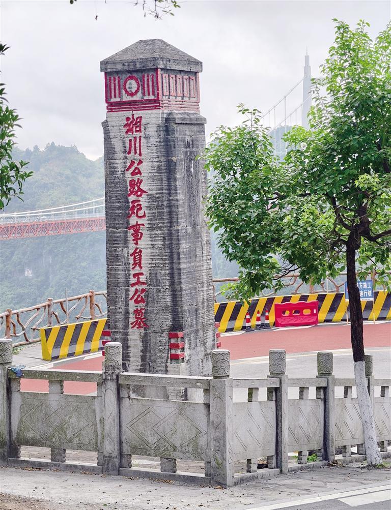 抗战时期,湘西的险峻山岭由天然屏障转变为战略命脉。1936年初,3万多湘西民工勇立生死状,自带干粮,风餐露宿,在“只有鸟儿能飞过的悬崖”上开凿连接大后方的交通生命线。建设者们腰系绳索悬空而下,用铁锤、钢钎打炮眼、凿悬崖,用柴火灼烧岩石12小时再泼水使其崩裂的土法开山,用人力拖拽40 吨重的石碾夯压路面……因医疗薄弱、施工事故,在这段6公里的路基里,填埋了200多湘西儿女的鲜血和生命。湘川公路全线通车后,矮寨坡道路旁矗立起“湘川公路死事员工纪念碑”和“开路先锋”铜像,前者记录这段路每30米就埋葬着一位建设者的血性和悲壮;而后者,正是湘西儿女以生命向侵略者发出的无畏宣言。