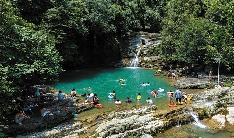龙山县洛塔乡的山谷间,葱郁林木环抱一汪碧潭,游客在水中放松避暑。 团结报全媒体记者 杨贤清 摄
